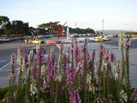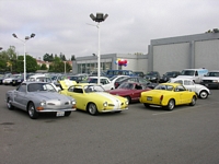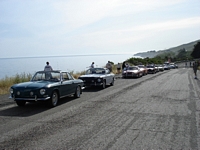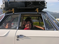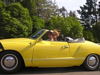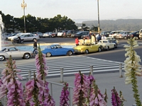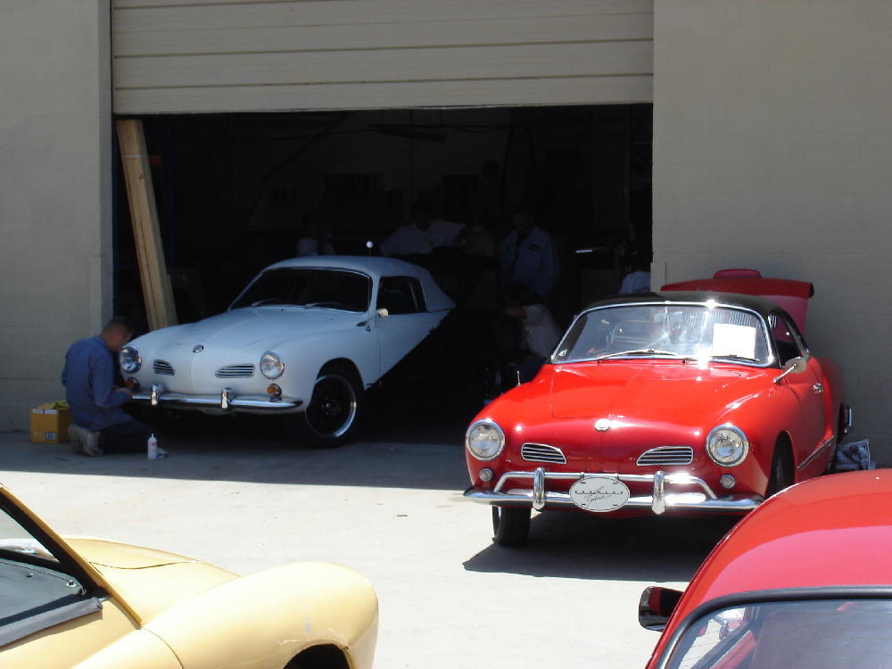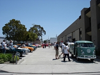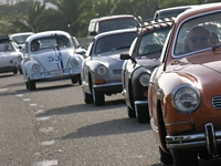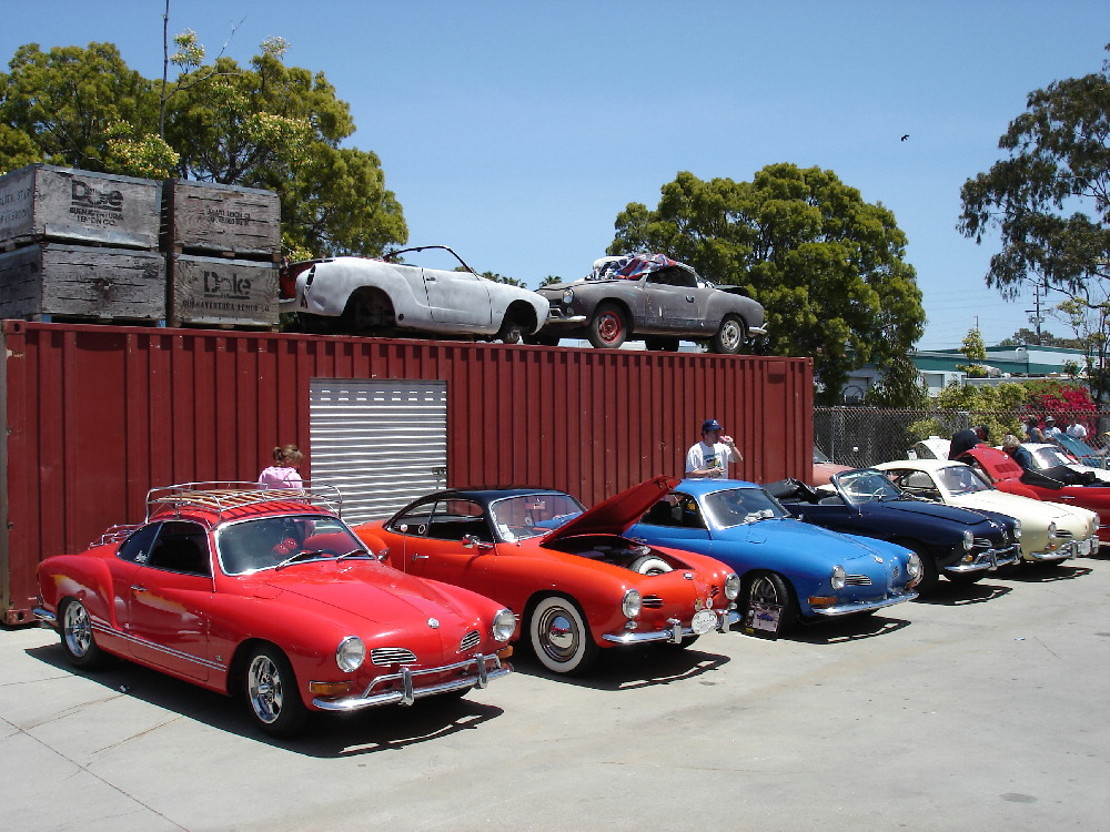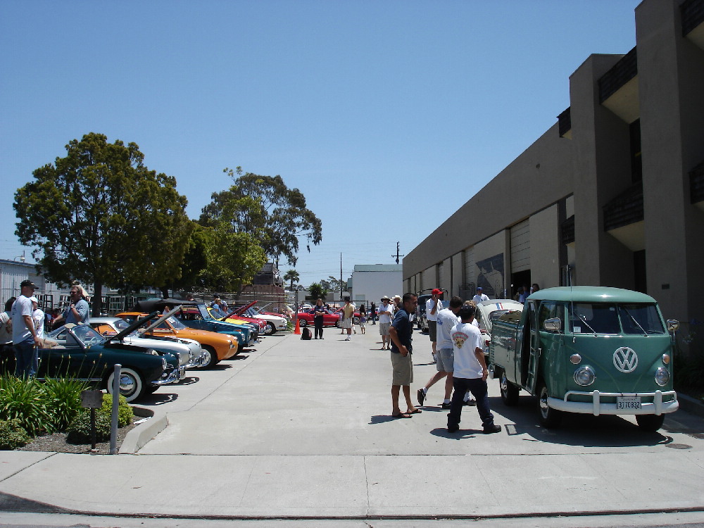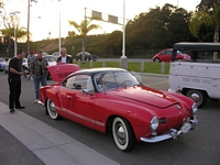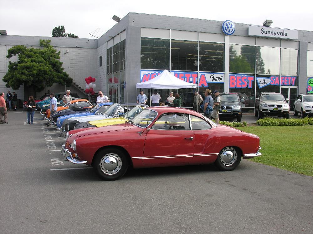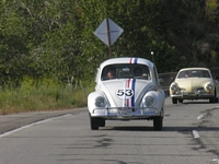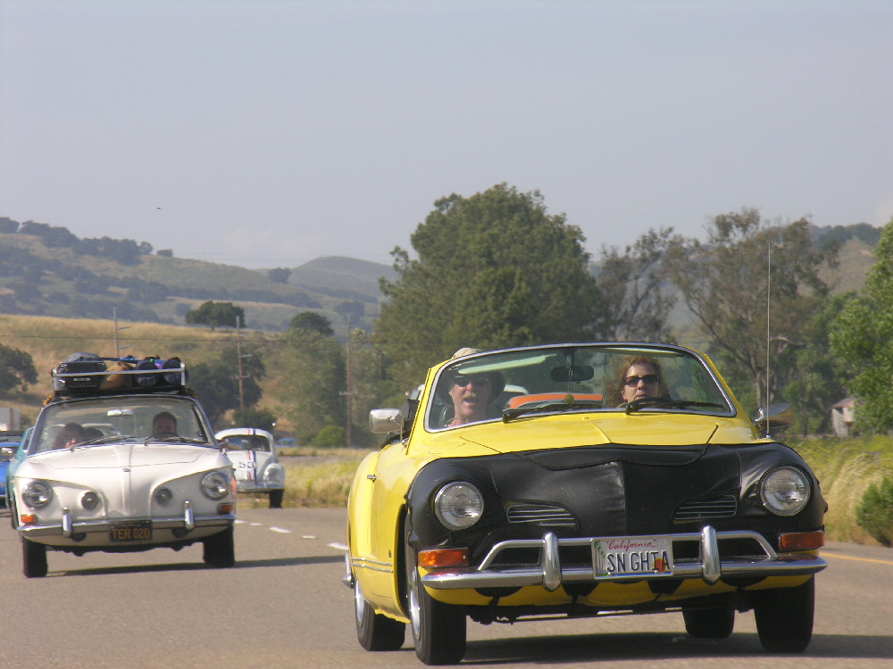 The next morning Sunnyvale VW sent us off with coffee and donuts and a few other goodies. We stopped in San Luis Obispo for lunch where we added a few more cars. Tom Reay had arranged for us to meet at Margies Diner for lunch and after lunch a local news truck showed up and interviewed me. Mary called up a friend in the area and were able to get it recorded for posterity. And then it was off to Barber VW in Ventura where we were served dinner. The next day KGPR hosted us for a Karmann Ghia show and shine before we all took off en mass for a cruise down to the Pacific Coast Highway to Santa Monica Volkswagen. Here we met up with Herbie and and got our first glimpse of the media hoopla that would follow us across the country.