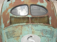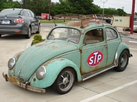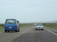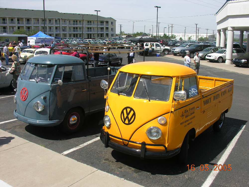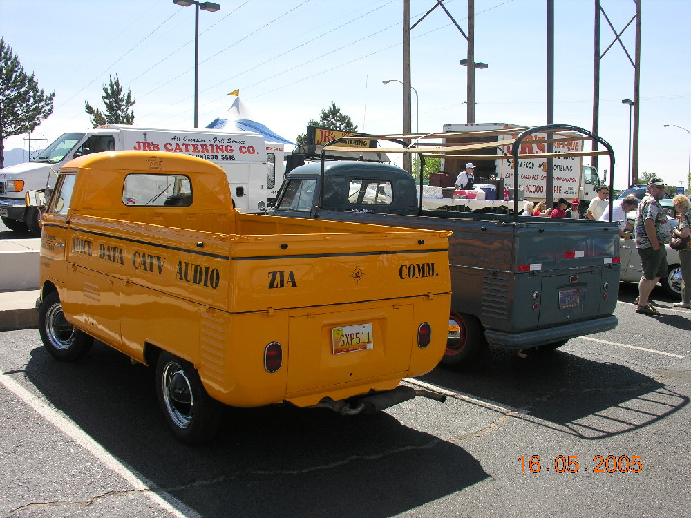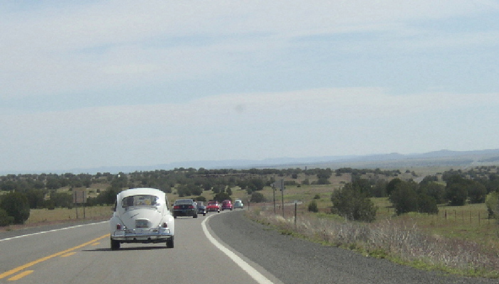 The next morning I drove over to get gas figuring everyone else had done that the night before. When I got back I found that I had missed the drivers meeting where the main points were first, everyone needed to get gas, and second, Frenchy was going to take the lead for the next leg.All good by me as my confidence was not fully recovered yet from the night before. It was a beautiful morning and the countryside was greener than the California desert...though my co-pilot, Dave Whitaker, kept commenting how the desert was never this green so it was an exceptional rain year. But it was still desert so I was looking forward to getting to greener pastures. After a hundred miles Route 66 ended and we were back on the freeway. We were soon on a long grade up to Flagstaff and at the base we were joined by our 5th Type 3 Ghia of the trip driven by Steven Ayres. I was thrilled to see as many '66 T34s on that one trip as I had seen in total the whole time we've owned ours. There just aren't that many '66s around. Everyone...well not everyone...was making good time. Rachel and Bill didn't have the horses to get up that hill with us so our support vehicle stayed back with them. Our lunch stop was Winslow, AZ and a few of the cars headed downtown to check out the famous landmark that they found had tragically burned down several weeks before. The rest had directions to meet back at the parking lot near the freeway after lunch but the stop wasn't planned well and the plan fell apart with people starting out early so the next leg, over the continental divide and into Grant, NM, was a futile attempt to pull others together. That night we had a sometimes heated meeting to straighten out the expectations and rules for the rest of the trip. From now on we would attempt to keep a pace that everyone could handle. As we only had one more day left in the desert this would be increasingly easy to do.