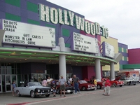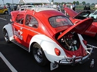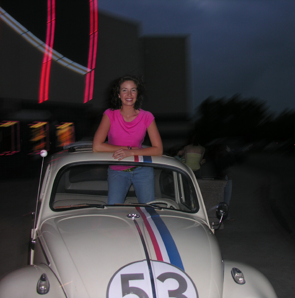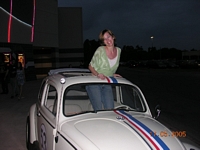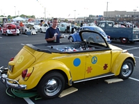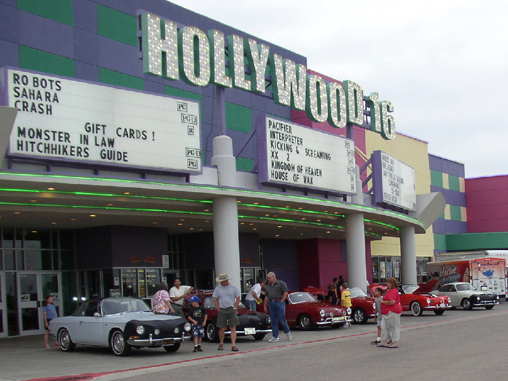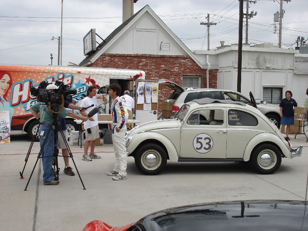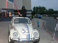 The next morning was one of the only legs of the trip that was further than one gas stop. Our destination was University VW in Albuquerque, NM. The trip chroniclers were taking advantage of the open freeway to get some shots of the string of VWs and I was trying to make use of the hills, faster downhill to get a running start on the uphills, to make best use of the capabilities of our slower cars. This approach worked well most of the day until a particularly long hill just before our afternoon gas stop. When we pulled into lunch we were thrilled at the number of people that turned out to greet us. A big western barbeque was spread out for us while Richard Troy set up his traveling History of the Karmann Ghia slide show. After lunch a couple cars were up on lifts in the service area and after spending several hours there were able to join us later that evening. That afternoon we got surprised with a request for our presence at a Disney gig in front of a local theatre in Amarillo, TX. The timing forced us to keep a steady pace with few breaks but we managed to arrive on time not long before sunset. About a hundred locals had come out to be seen with Herbie.