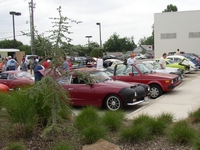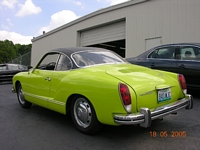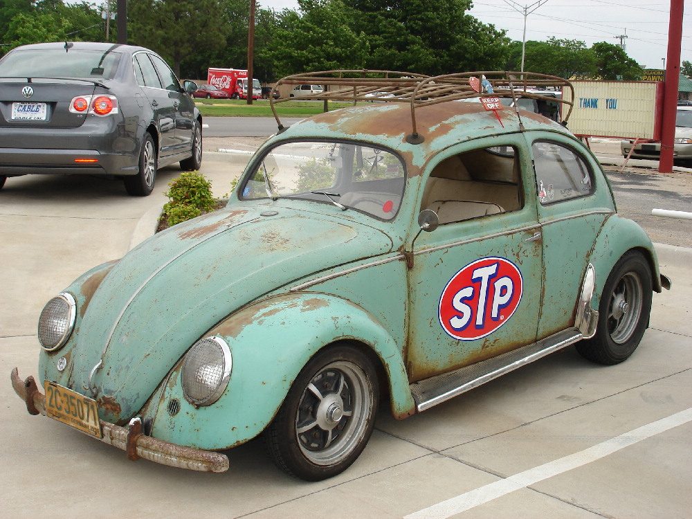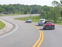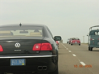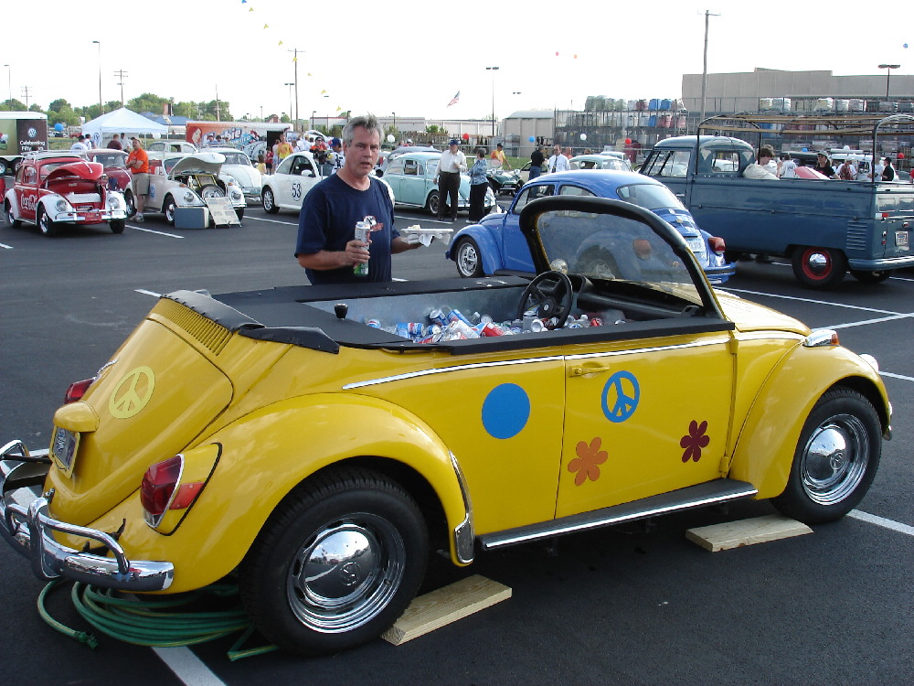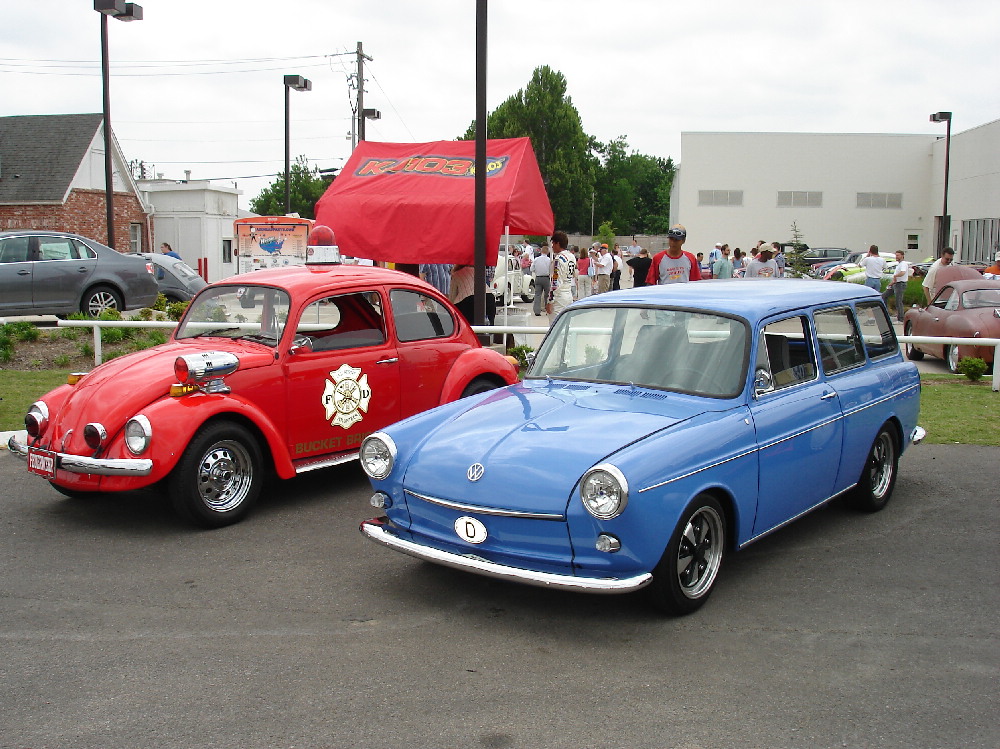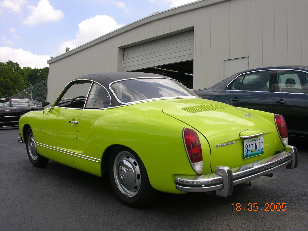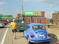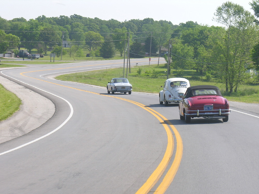 Today we are to cross the Mississippi but the first hurdle for us is to survive a real midwestern storm. It started raining hard before dawn and when it came time to group together to leave we were fortunate to find a gas station overhang to stage from. Several of us were double checking wiper systems that we have only rarely used. Bill had to stop on the freeway to fix his and we all stopped after the toll entrance to regroup after surviving the sloppy morning commute. Fortunately we ran out of the storm within an hour and by the time we reached the Missouri border we were off the freeway and following another pleasant 2 lane highway, US 60, into Springfield for lunch at Youngblood VW. In spite of it being a weekday there was a good crowd awaiting our arrival. The highlight of this stop was an original dealer installed vinyl roofed Ghia in excellent condition. After lunch we were back on a rolling hills kind of freeway headed for St. Louis at rush hour. Our challenge was to cross the Mississippi over to Auffenberg VW in O'Fallon, IL while staying in a group. We did well keeping each other in site and in contact on the walkie talkies until just before the bridge. Then just after Dave and I turned on the bridge it fell apart as we heard that Rachel was stopped on the approach to the bridge. With only a couple other cars with us and no shoulder or off ramps in site we had little choice but to continue to Auffenberg VW. Fortunately a can of gas got Rachel back on the road and everyone else straggled in with a half hour.