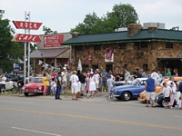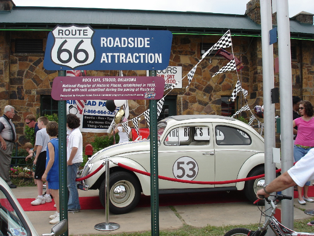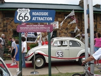 As we put miles behind us the next morning the landscape started to change. By the time we got to Cable VW in Oklahoma City we were seeing a mixture of long flat farmlands with an occasional woodland down in the valleys. The wind in this part of the country seems to preclude the possibility of trees in the unprotected areas. The OKC VW club was out in force to meet us and we had another great lunch. After lunch we headed for another stretch of old Route 66 that would take us through the town of Stroud where we stopped for a taste of the Rock Cafe's famous peach cobbler. The whole town came out to meet us, even the mayor. Then it was off for a few more miles on 66 before we got to our dinner stop at Brad Noe Autoplex in Tulsa, OK. The Tulsa VW club was the biggest yet and here was another one of those '66 T34s.