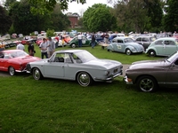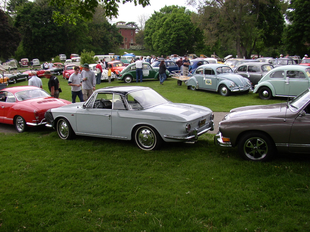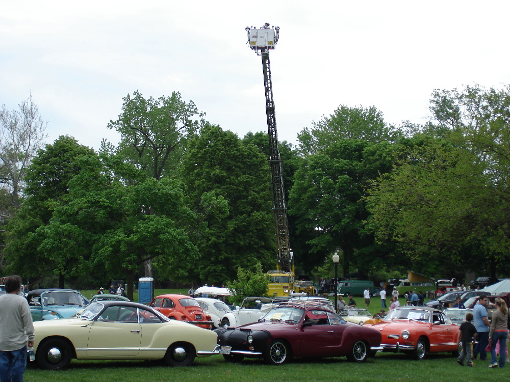 As we headed down to the park where the show was being held the weather looked doubtful. It held out for awhile and I got some swap meet hunting done. Then the organizers had us arrange a bunch of the cars into a big huge Herbie 53 and then a 50 to celebrate the 50th Birthday of the Karmann Ghia. A plane flew overhead and the local fire department came by with their ladder truck to get some shots of the spectacle. An amazing thing happened...there were enough Ghias, about 60, to circle the whole number. Having that number of Ghias show up in the heart of the Michigan rust belt was an amazing show of support for the trip we were making. All too soon it started drizzling and later got heavier. One of the regular events, the pass and review as moved inside the big tent and I was asked to bring the T34 in for this honor. After lunch we called it a day and headed off to our next hotel. Some of the cruisers decided to go to a movie but those of us not interested ended up spending the evening in the back yard of a local having a barbeque.