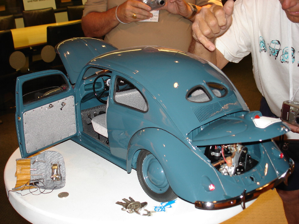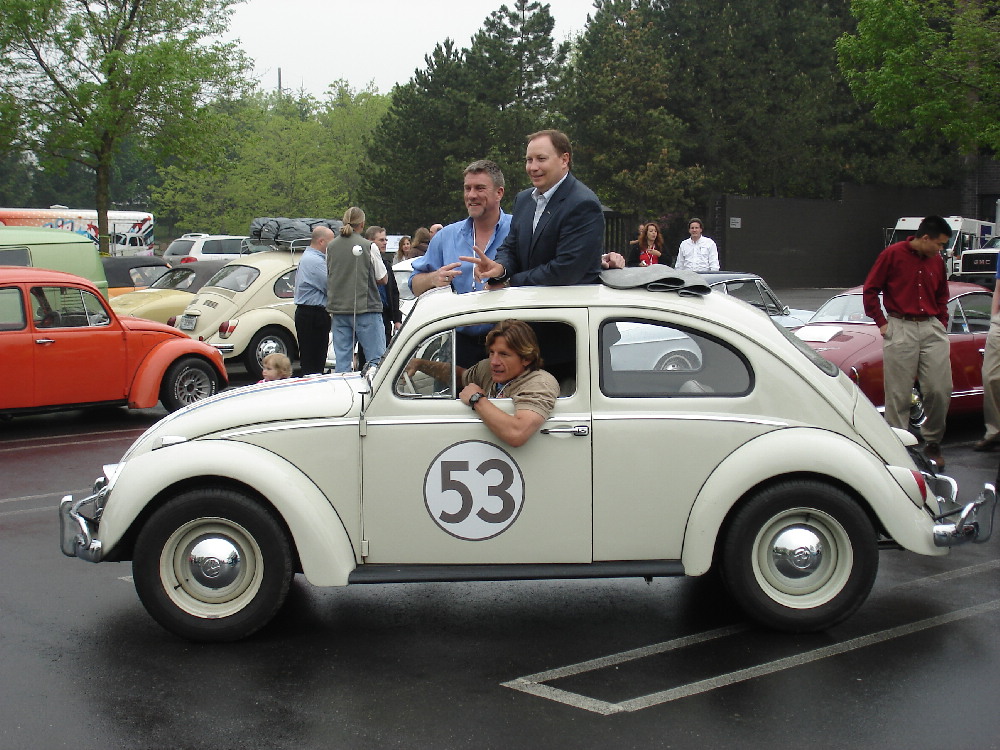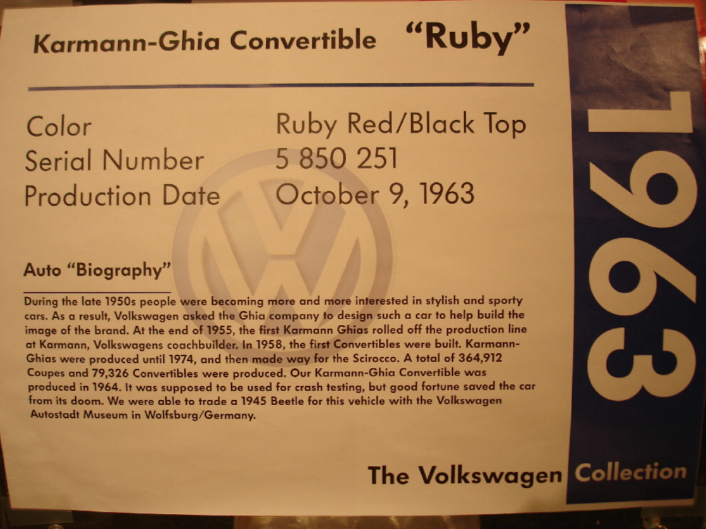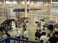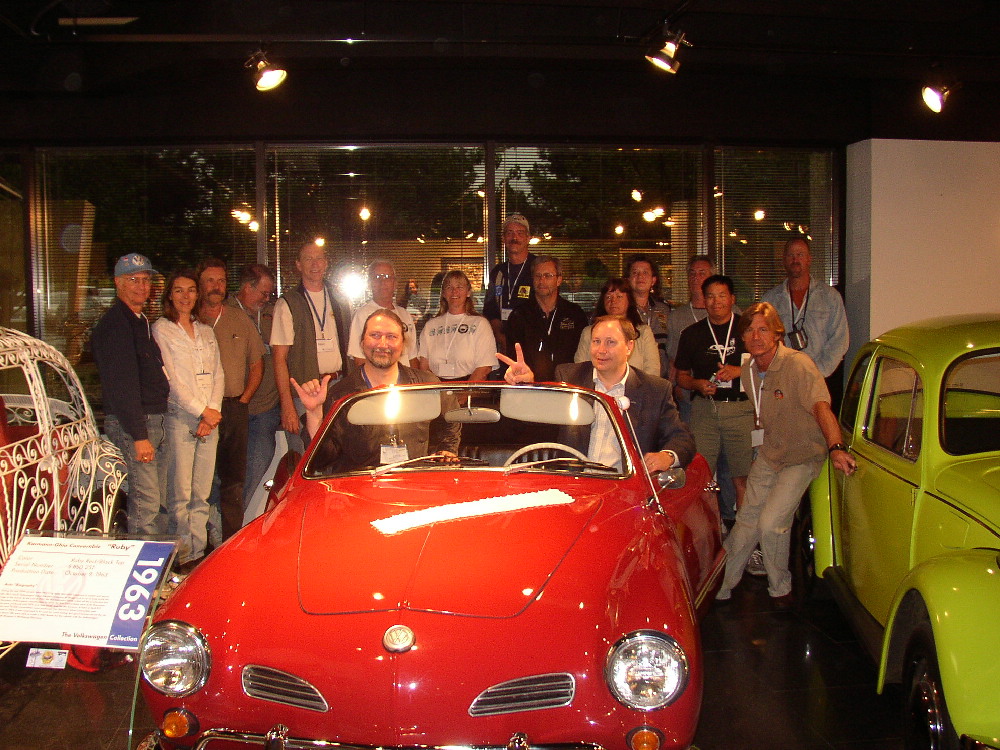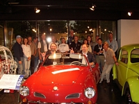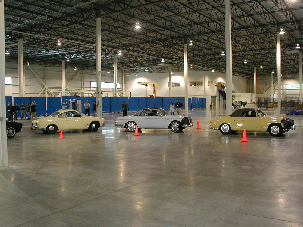 The next morning the weather looked bad again as we set off up another of Michigan's cratered freeways heading for VWoA headquarters. They first treated us to breakfast and then we spent a couple hours getting the full tour of their museum from our own party member Clark Campbell. Clark had pulled a '63 Ghia convertible named Ruby out of their collection and shipped it to California to join us on the cruise. There was some pretty cool stuff in the collection and while it is no Wolfsburg Autostadt it has a well picked representative collection of Volkswagens and memorabilia. While we were there the VWoA employees had a chance to come out and check out the 30 or so cars in our group. From there we had another 45 minute drive over to the new Karmann facility in another Detroit suburb. In Plymouth Karmann had built a large factory to build convertible top systems for the American car market. The facility was still empty but will soon be equipped for their first project with Pontiac. They fed us lunch and then took us to see several working models of their products. From there they had all the Ghias drive into the empty factory where we pretended to be the last Karmann Ghias made in 2005. We said goodbye to several members of our troupe here and headed for our next dealership meal at Ed Schmidt VW in Perrysburg Ohio. The rain followed us much of the way there so I was thankful I had found replacement blades at one of our previous dealer stops to replace the NOS blades I started the trip with. That night Bill Smith rebuilt Rachel's carburetor in our bathroom sink as the rest of us partied a bit. The hardest part was now behind us and the days from here on out would be easier to complete.