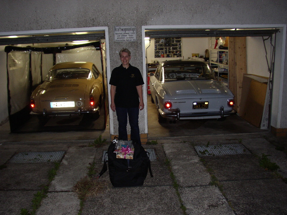 It was 4 long weeks before the second half of our vacation. Of course some of that was spent playing catch up at work and there were still details of the trip to deal with such as insurance and delivery issues in Europe. But the anticipation was killing me. Mary was also really looking forward to the trip having missed the first half because May is a busy time in the balloon decoration business. When the day finally arrived though we were able to go in style. I got 3 1/2 hours of sleep the night before we left to make sure I could fall asleep on the plane. Mary's good customer Brent picked us up in a nice Lincoln limo and took us up to SFO for free. Then I started the trip off by forgetting the camera bag in the car. After much drama Mary managed to get through to Brent and he made the 25 minute trip back to drop it off. With that bullet dodged we made it through security and settled in for the looong non-stop flight to Amsterdam. I, unfortunately, had someone in front of me that insisted on reclining into my 6'3" frame so much of the flight was spent contorted into limited positions. That did not bode well for me later in the trip as my lower back started to get out of whack after a fitful night in the air. Our luggage was the next problem. We waited and we waited, then went to the baggage counter. A search was instigated and all the bags eventually showed up. There was no way our standard suitcases would fit in the Ghia so I brought one big duffel bag that held several smaller bags and camping equipment that could more easily be fit into the car's many storage areas. From the Amsterdam airport we would be hopping a train to Hannover and the train station is attached to the airport so a convenient cart made it easy there. After my previous night I was hoping to get some shuteye on the train but the seats weren't really much good for that so when we arrived in Hannover a few hours later we were really, really glad to be done with that leg. We were to meet Ute Groener, who had been storing our car in her garage for a week or so, at the station but not knowing what she looked like proved a challenge. And, the station has 2 entrances at opposite ends so while Mary stood by the baggage I went up to one end. Just as I got back to Mary we were paged in English so we dragged our bags down the way I had come from to meet Ute. On the way to her home we had half an hour to get to know her before we arrived, via a little back road, at a charming German style pub/restaurant with a handful of rooms above. It reminded me alot of the place we stayed at in 2001 for the 100th. Ute left us for an hour so we could shower and change out of our 2 day old clothes. Then we went down for a beer until she showed up to take us over to see the car. It seemed to have survived the ocean trip well but it appeared that the customs agent had gone overboard looking for drugs. I had put new speaker panels in next to foot area and a metal trim strip holding one of them in had been ripped out in the search. It also damaged the door edging and rubber but was fortunately able to get everything back to being at least presentable. Ute's '69 coupe was sitting in the next bay and I commented on how much it looked like Gobi Beige, which was a one year only color for 1968. She said it had been a special order from Karmann when new which explained the color. We found that Ute needed to drive to Georgsmarienhütte (GM) the next morning to help plan the 50th so I asked if we could follow along since we were headed that direction ourselves.