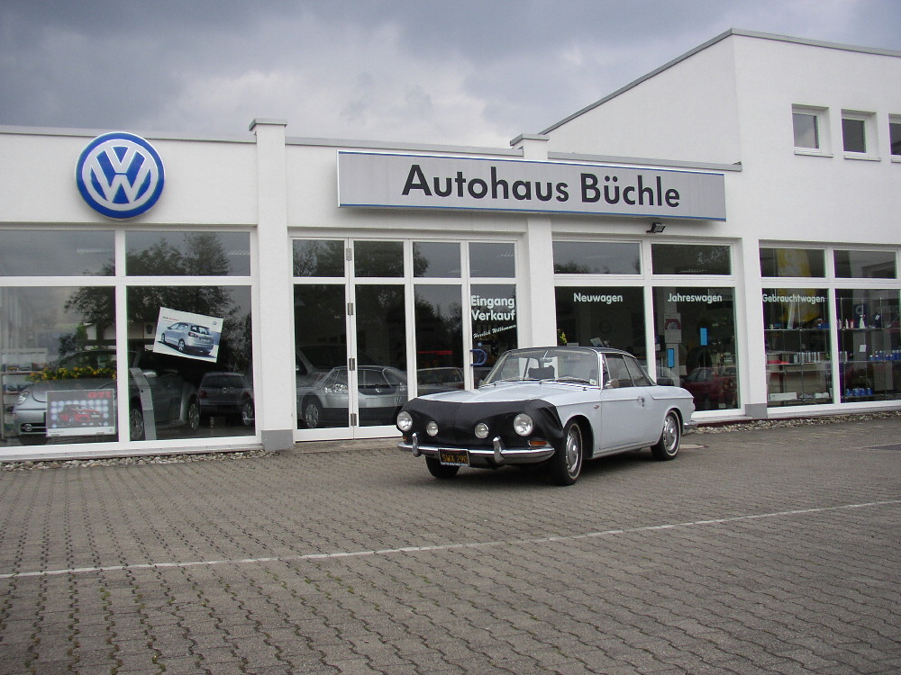 Sunday morning we started out by going down to the village to attend the protestant church service. They had the service outside the town hall and many were dressed up in old style clothes. Someone shot off a tiny cannon a couple times in addition to the bells calling everyone to the service. There was a brass ensemble playing and the minister was dressed old time as well. Surprisingly the service lasted only a half hour and then they broke out a bunch of drinks but we didn't stick around. We drove straight through to the German border and stopped in Lörrach for gas. I bought a town map and got directions to both the original and current locations for Büchle VW dealership. This is the Karmann Ghia (not just VW) dealership where our car was originally purchased in 1966. (Our original maintenance book shows that after being picked up here it had maintenance in Geneva and Lisbon before being shipped to San Francisco.) After stopping at the original site, now a new Lidl store, we went out to the next village and the new dealership where we took a bunch of shots. We headed up to Freiburg for the night to a charming and historic hotel.