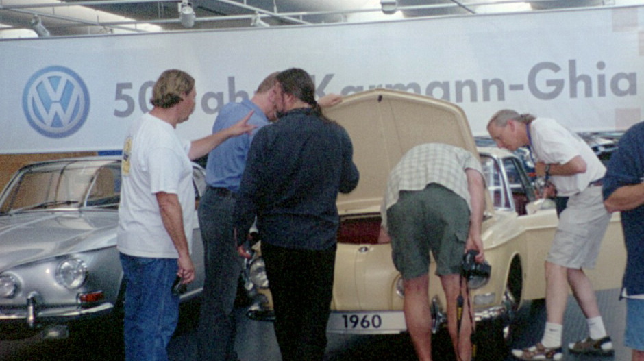 Today we were headed to Wolfsburg for a private tour at the Stiftung Museum so after an early breakfast with Tom and Terry Reay we headed out. We arrived in plenty of time for our scheduled tour and found Dave and Pat already there. They told us about their great trip through Switzerland and Austria while we waited. Jim Maljanian showed up just in time and we went in to meet with our guide. The tour started with the early Beetle stuff and then circled around through the Busses and other then a bunch of really unusual one offs before turning our attention to the Ghias. Richard spent some time studying the details of the early T14s there before I was able to draw them over to the T34 prototypes. Yes there are 2. We opened up all the nooks and crannies discovering that the 2 cars have "VR" vehicle IDs one number apart assuring that they were built at the same time. I had been making that claim since I first saw the 2 cars back in 1999. After thoroughly picking apart the cars documenting their construction we heard that there were some other cars outside being loaded into trucks from Karmann. We hurried outside and found an early T34 convertible and 2 T14s, all in white. The '53 prototype was also out there and we found that it was due to stay ther at the Stiftung during the time we would be celebrating the 50th. This was very disapointing news for us but we knew it would be even more so for the hundreds of people coming to the celebration. There was nothing to do but bring the news back to GM so that those who could afford the time to come to the Stiftung after the show. Here's a more detailed account of the PROTOTYPES