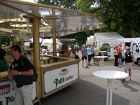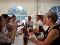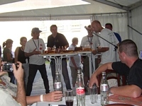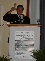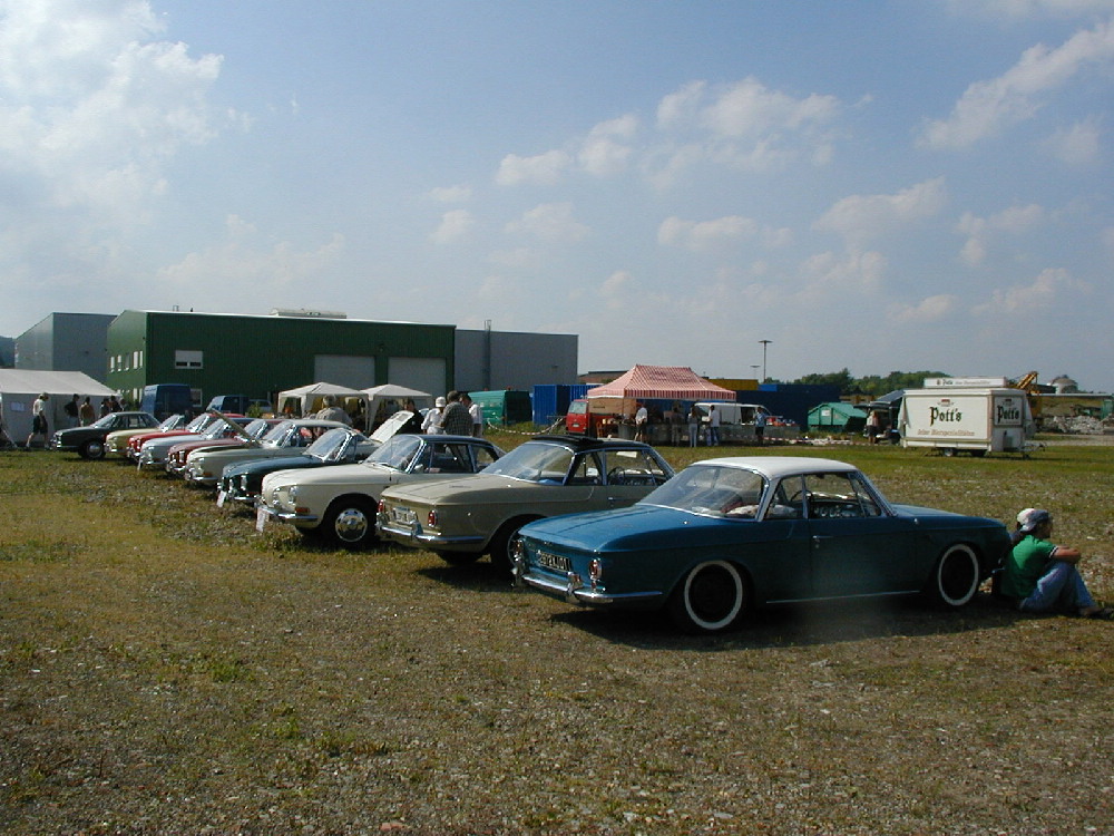 After breakfast I went out and adjusted the valves and the points but it was getting too hot to worry about taking out the spark plugs. I had to get downtown to meet with the newspaper reporter and when I started out the car sputtered a bit but by the time I got on the freeway it was running fine. At the newspaper offices I was led through one hallway and up a stairwell and then another, each time being handed off to a progressively better English speaker until I met Swen who was going to interview Richard and I. Richard hadn't arrived yet so I started in with a brief synopsis of the history of this gathering. I made it up to the night we did the vision when Richard came in and took over the conversation. In quick order he had his computer out and started with pictures of the 100th. When Swen tried to steer it back to the present day Richard fumbled a bit looking for the San Francisco pictures from the beginning of our adventure so I booted mine up and pulled up the pictures I have. I flipped through the America trip and then showed a few pictures from our trip so far in Europe. The interview finally wound down around 12:30 and we went outside with a photographer who positioned us with the cars. Afterwards Richard went off to deal with his T-Mobile problems and i went down to the Hymer dealer to pick up our new gravel guard for our Eriba Puck that we had ordered our first time through Osnabrück two weeks ago. I came back and ate lunch with Mary and as we were getting ready to leave Dave & Pat & Hank & Wilma showed up. Hand and Wilma were able to get a room across the hall from us. We went on ahead to register the car while they unwound with a beer. When we arrived at the field there were about 75 Ghias, 12 of which were T34s, there already. The swap vendors were there as well and I picked up a set of fog light rings and lenses from Lars and we bought some shirts and mugs. Around six we all wandered over to the casino where some food and beer booths were set up. Then we went to the tent behind for the evening program. We had some more beer and then Tobias and the other club leaders come out with a bunch of birthday cakes. They blew out the candles and passed the cakes around. It was a bit like the loaves and fishes scene at the Sea of Galilee as there turned out to be plenty to go around the full house. As that all started to wind down I pulled out the laptop and showed the pictures from both parts of the trip. I had about a dozen people around watching.