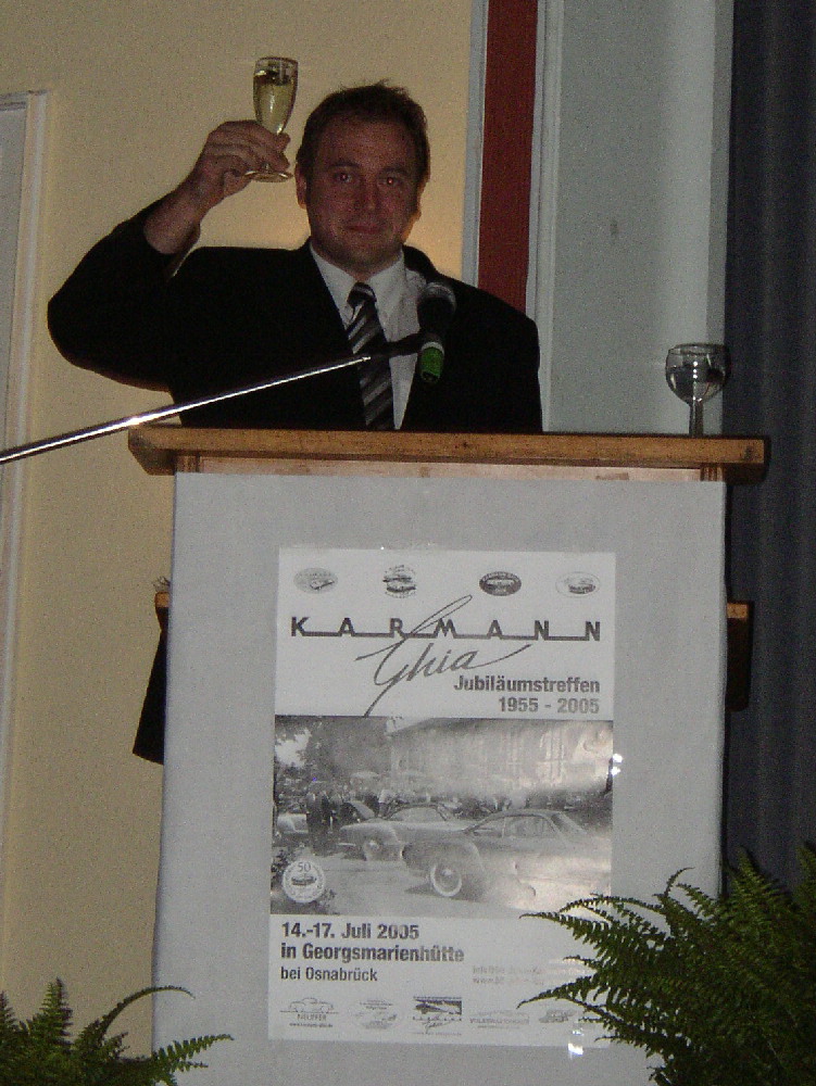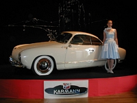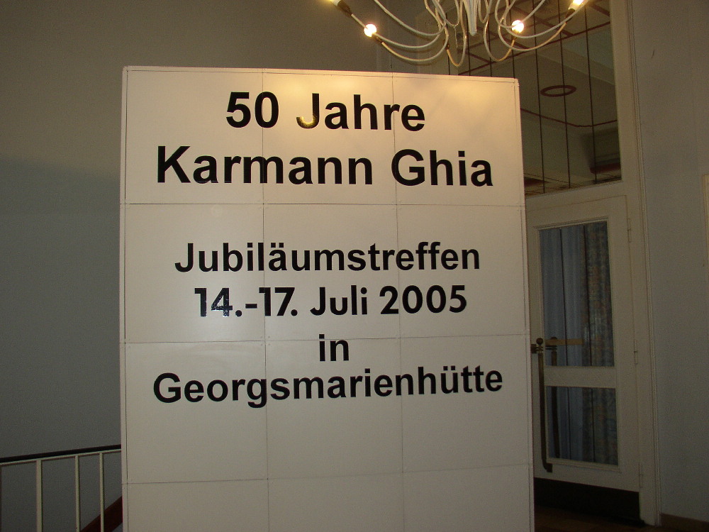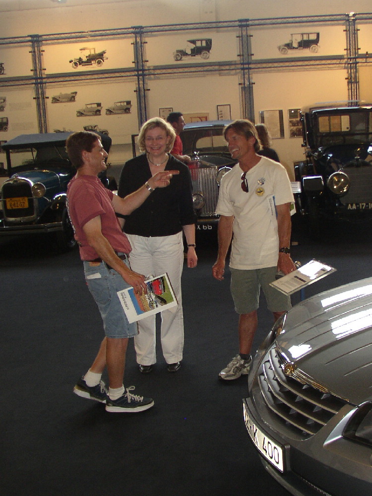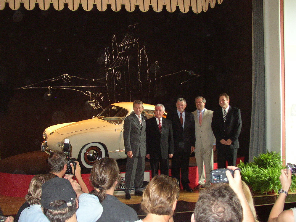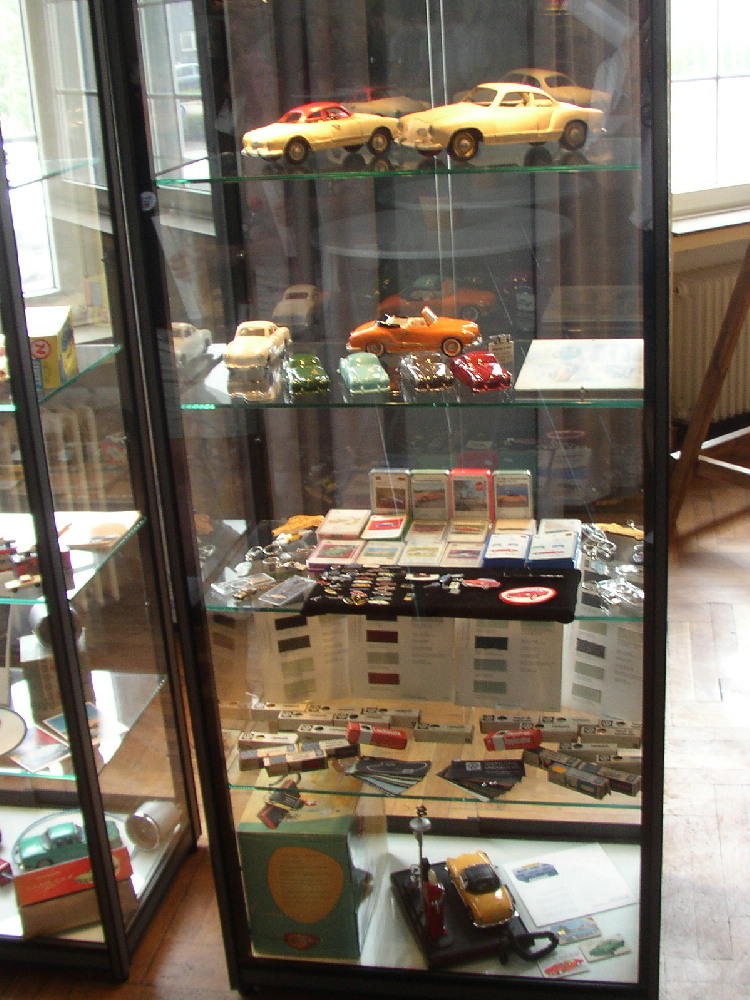 While we were eating breakfast Jörg Fischer came in and sprung a request on me to show some of the pictures from the trip. After pondering briefly I decided it would be simple to copy the best pictures to another folder and rename them to fall in order for easy viewing. I wouldn't have time, as it turned out to do this until after noon. Jörg had, incidentally, arrived late the previous night after we had at first heard that he couldn't make it. His 7 1/2 month pregnant wife decided to wait awhile longer before having the baby and had sent him on along to join us. At breakfast we had been told not to be late for the 9:30 morning program so we hurried down to the bank to cash the rest of the travelers checks and then over to the park. When we walked into the main room at the casino I spent a few moments admiring the huge toy collection that had been assembled before taking a spot front and center. I sat down on the floor to take the weight off my hip as the room began to quickly fill to capacity. I had a perfect vantage point to snap pictures of the speakers - Tobias, the mayor of GM, Wilhelm Dietrich Karmann, and a man from Volkswagen. Then the organizers began to pass out glasses of champagne in anticipation of the grand unveiling. At the right moment the curtains opened to reveal a gorgeous '56 ivory coupe that belonged to the woman on our right, Marguerita. It was displayed in the same style and position as had originally been done in 1955 and after a few moments they even brought out a model dressed in period clothing. After that wound down I was pulled into the back room to make sure the 'beamer' video projector would work with my computer. With that testing done we went back to the cars and did some swap shopping. Around 11:45 I realized I had better get working on the slide show so I went back to work on that at the casino out of the sun's glare. As the first speaker went through his presentation I began to get nervous that I wouldn't get done in time but it all came together nicely. The talk went well according to those in attendance and I finished in about 20 minutes. After going back to hang out with the cars for while it was our turn to head over to see the Karmann collection. There were about 40-50 Karmann Ghias in our group plus a bus full of others. There were 5 tours in all. We met Karin Schlesiger there and had a hug and a nice chat. We also went up and introduced ourselves to Dr. Eich and thanked him for having us there. We picked up a few goodies from their shop and headed back to the field for the remainder of the day. Shortly before dinner time the skies opened up and it rained sideways as people scrambled to protect their cars. Twelve Americans and Brits had dinner together in the casino before calling it a night.