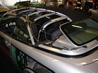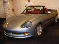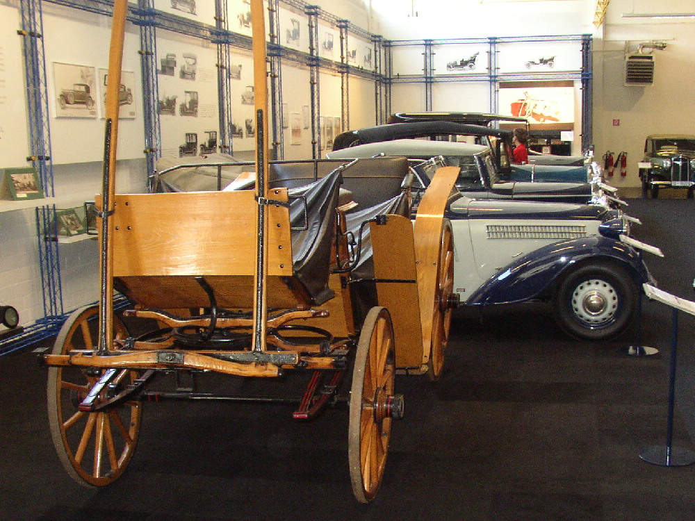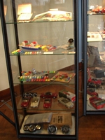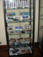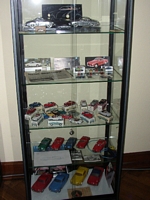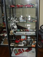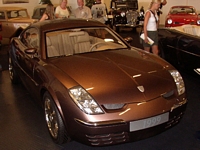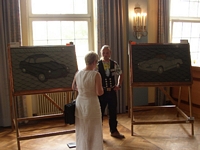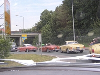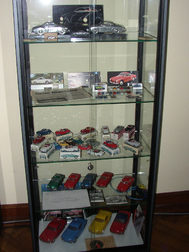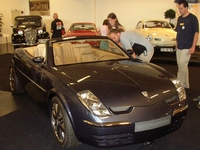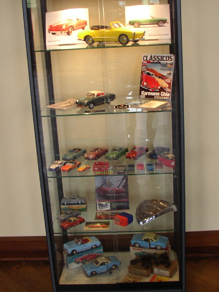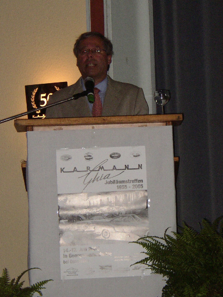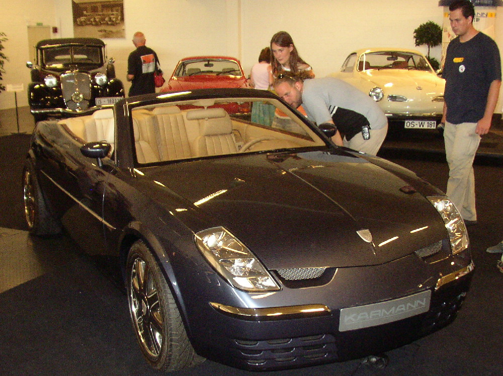 While we were eating breakfast Jörg Fischer came in and sprung a request on me to show some of the pictures from the trip. After pondering briefly I decided it would be simple to copy the best pictures to another folder and rename them to fall in order for easy viewing. I wouldn't have time, as it turned out to do this until after noon. Jörg had, incidentally, arrived late the previous night after we had at first heard that he couldn't make it. His 7 1/2 month pregnant wife decided to wait awhile longer before having the baby and had sent him on along to join us. At breakfast we had been told not to be late for the 9:30 morning program so we hurried down to the bank to cash the rest of the travelers checks and then over to the park. When we walked into the main room at the casino I spent a few moments admiring the huge toy collection that had been assembled before taking a spot front and center. I sat down on the floor to take the weight off my hip as the room began to quickly fill to capacity. I had a perfect vantage point to snap pictures of the speakers - Tobias, the mayor of GM, Wilhelm Dietrich Karmann, and a man from Volkswagen. Then the organizers began to pass out glasses of champagne in anticipation of the grand unveiling. At the right moment the curtains opened to reveal a gorgeous '56 ivory coupe that belonged to the woman on our right, Marguerita. It was displayed in the same style and position as had originally been done in 1955 and after a few moments they even brought out a model dressed in period clothing. After that wound down I was pulled into the back room to make sure the 'beamer' video projector would work with my computer. With that testing done we went back to the cars and did some swap shopping. Around 11:45 I realized I had better get working on the slide show so I went back to work on that at the casino out of the sun's glare. As the first speaker went through his presentation I began to get nervous that I wouldn't get done in time but it all came together nicely. The talk went well according to those in attendance and I finished in about 20 minutes. After going back to hang out with the cars for while it was our turn to head over to see the Karmann collection. There were about 40-50 Karmann Ghias in our group plus a bus full of others. There were 5 tours in all. We met Karin Schlesiger there and had a hug and a nice chat. We also went up and introduced ourselves to Dr. Eich and thanked him for having us there. We picked up a few goodies from their shop and headed back to the field for the remainder of the day. Shortly before dinner time the skies opened up and it rained sideways as people scrambled to protect their cars. Twelve Americans and Brits had dinner together in the casino before calling it a night.
